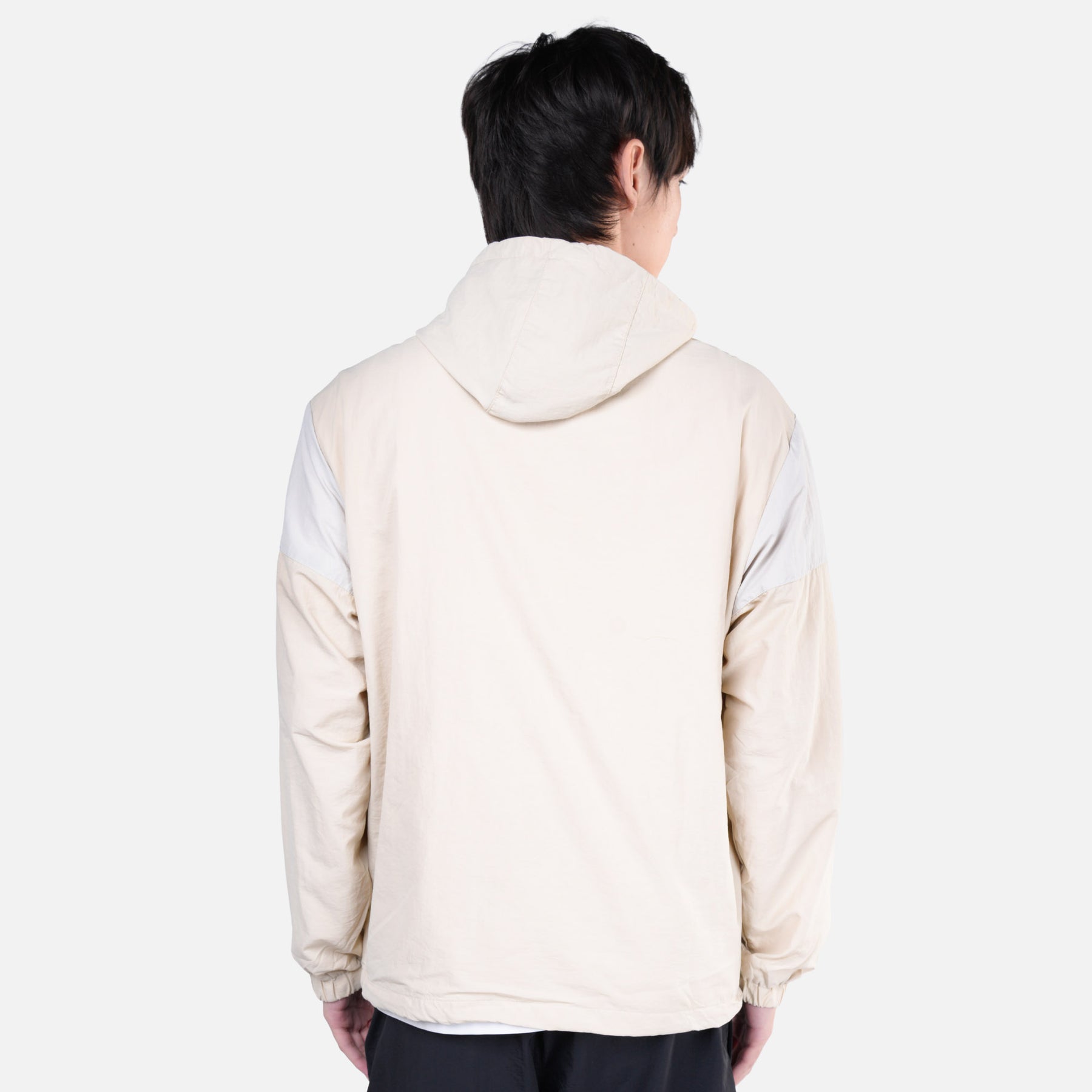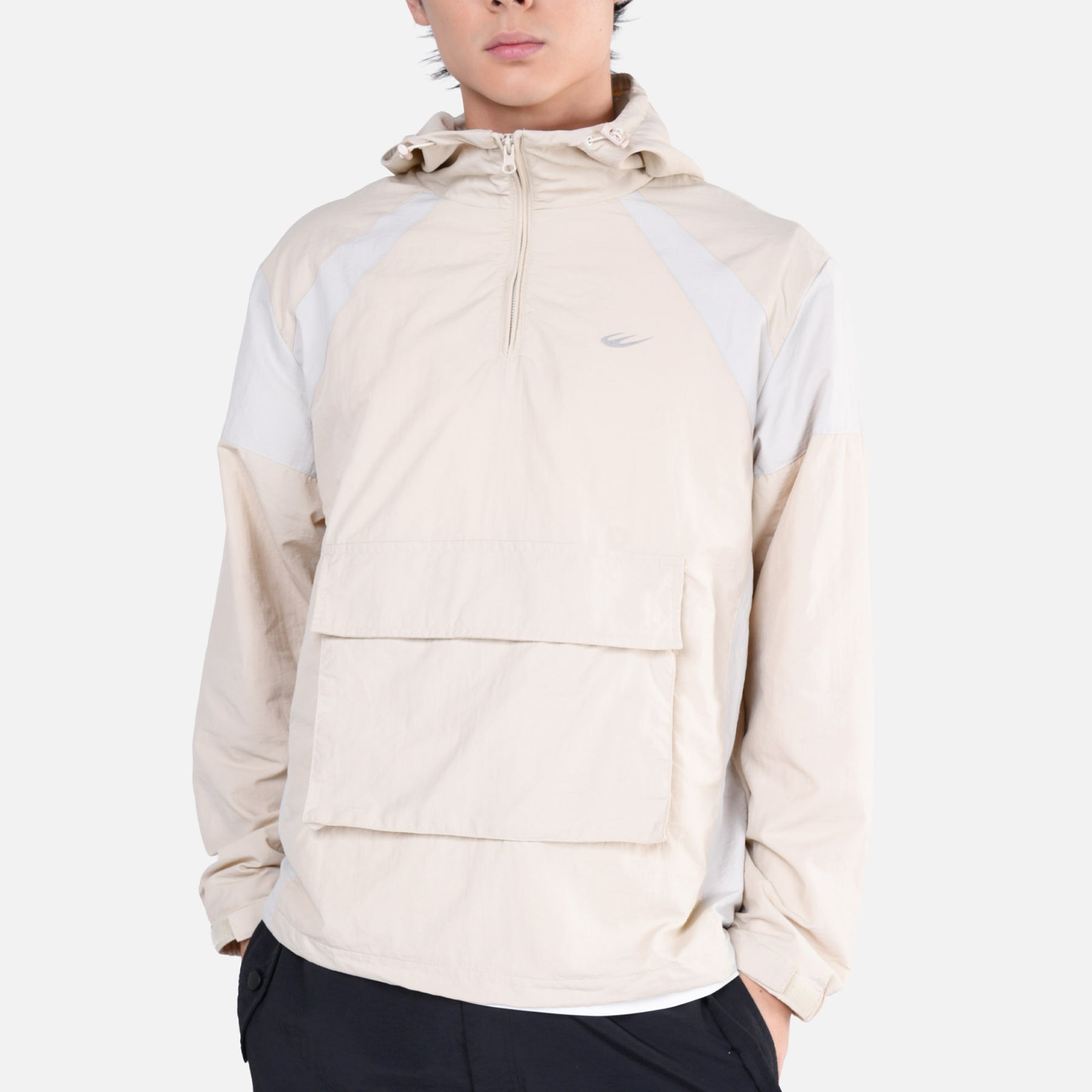 This men’s pullover jacket features a half-zip closure and contrasting color panels on the sleeves and sides.