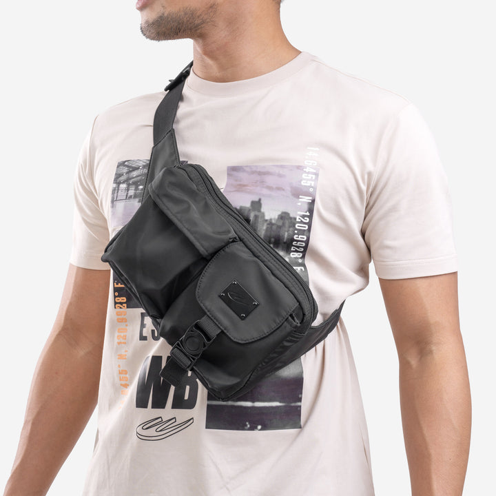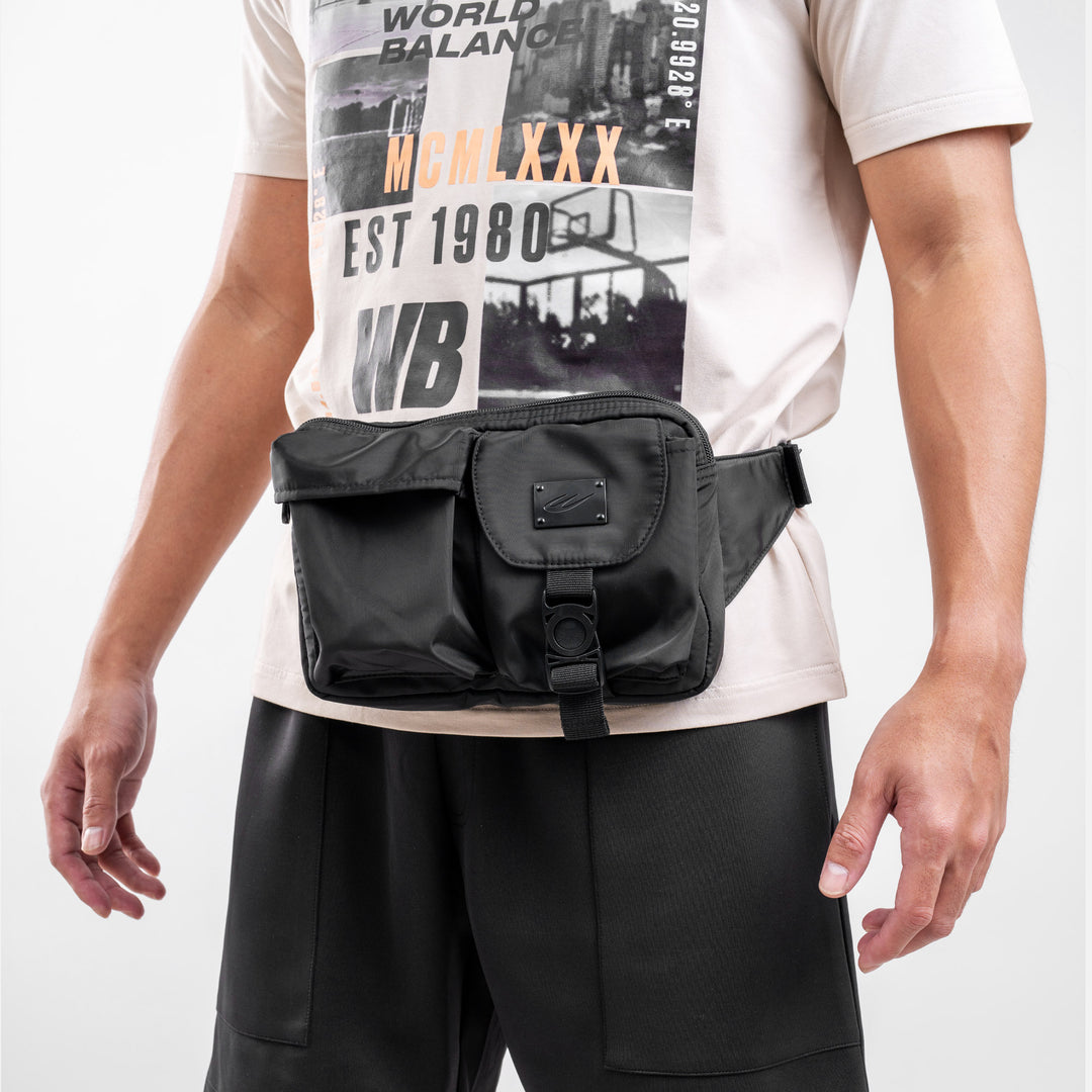 This body bag for men features the World Balance icon logo on the front in a metal patch.