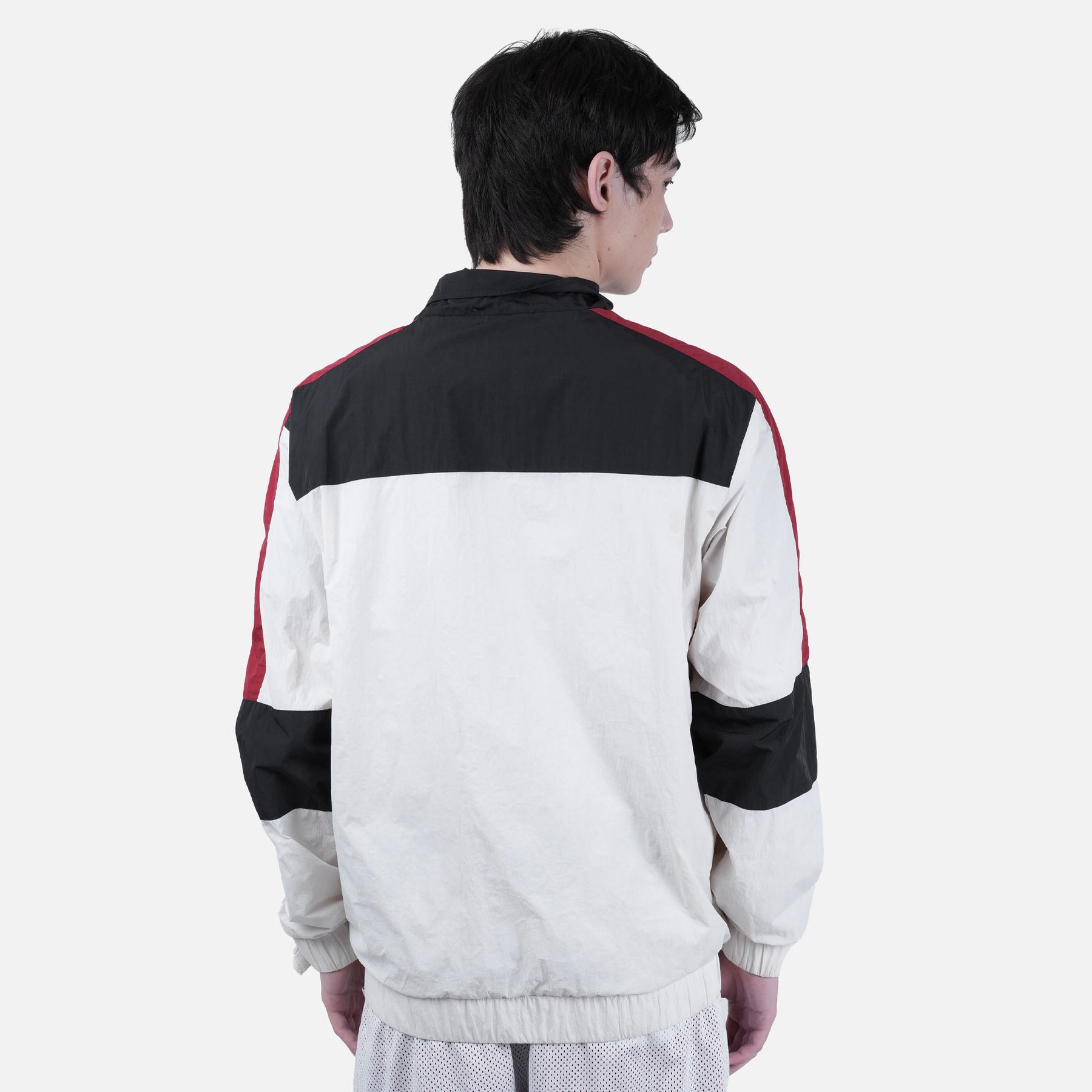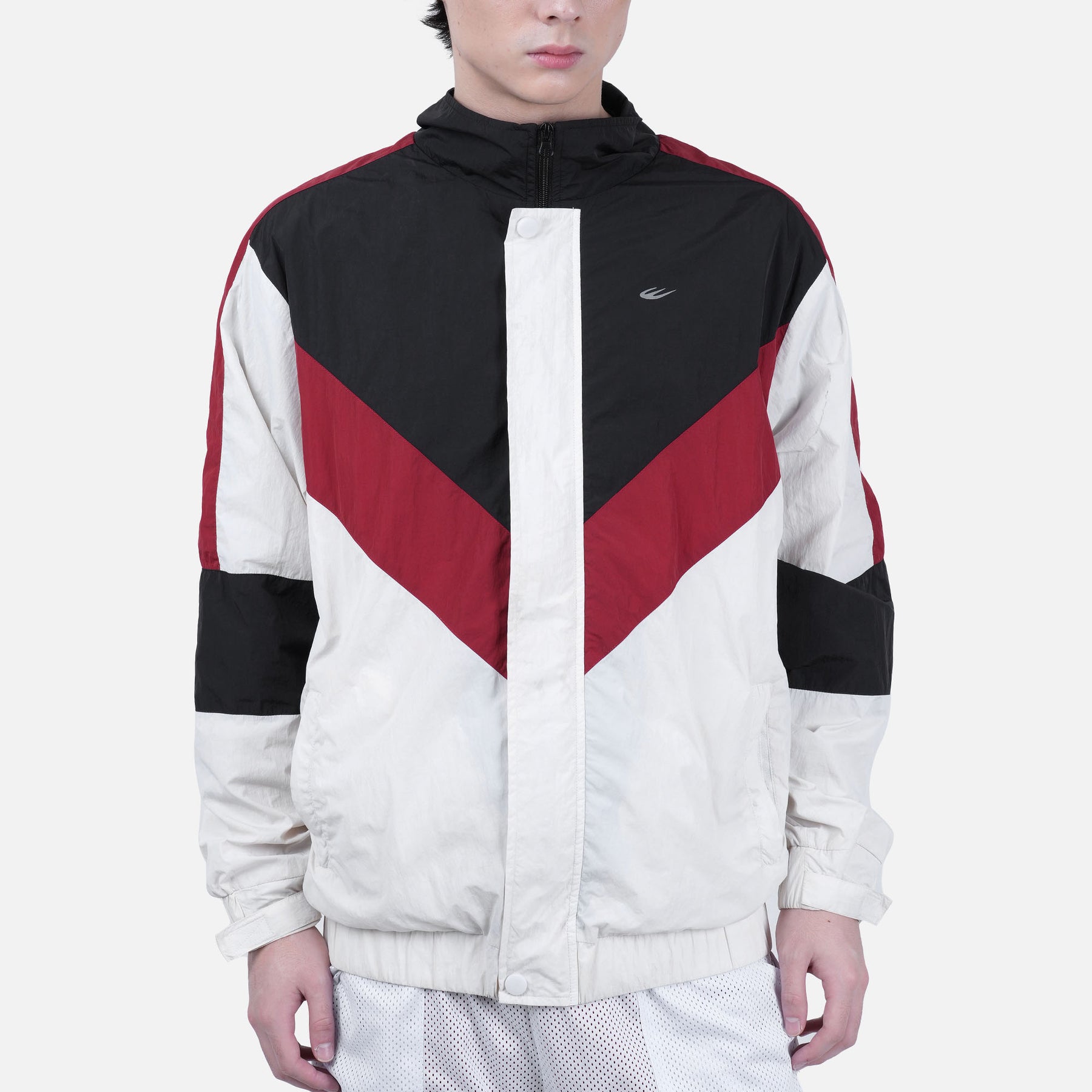 This men’s windbreaker-style jacket features a color-blocking design for
